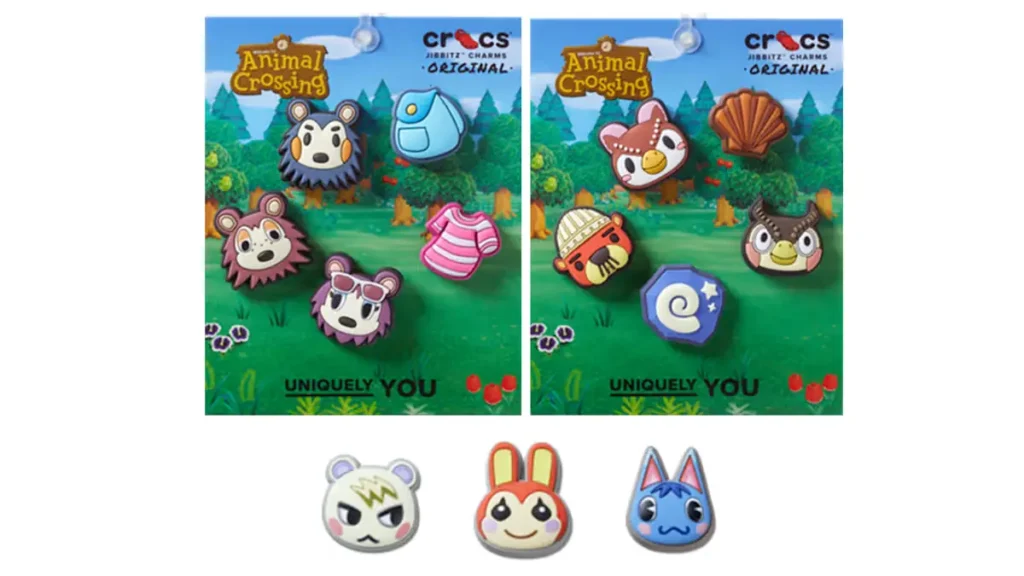 Ιδιαίτερο ενδιαφέρον παρουσιάζουν τα διακοσμητικά Jibbitz που απεικονίζουν αγαπημένους χαρακτήρες όπως τον Tom Nook και τον K.K. Slider, καθώς και χαρακτηριστικά στοιχεία του παιχνιδιού όπως σπίτια και μηλιές. Όπως ακριβώς στο παιχνίδι, οι καταναλωτές μπορούν να προσωποποιήσουν τα υποδήματά τους με εναλλάξιμα διακοσμητικά.
