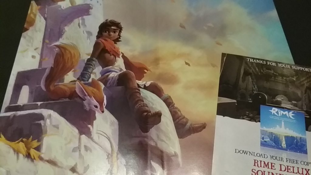 Μέχρι τώρα οι συσκευασίες των games του Switch δεν περιλαμβάνουν έντυπο υλικό,η Grey Box φρόντισε να ανταμείψει όσους εμπλουτίζουν την retail συλλογή παιχνιδιών. Ανοίγοντας την game case εκτός από το (πικρό) cartridge θα βρούμε μια καρτέλα με link για δωρεάν download της συλλογής Rime Deluxe Soundtrack:
